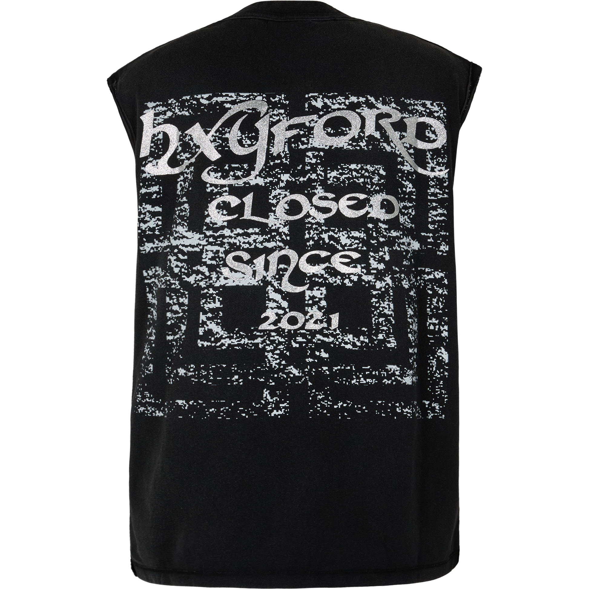 Black-out tank. Minimal front, disrupted back. Stamped with “Closed since 2021” — the beginning of an era. Clean cut, heavy statement.